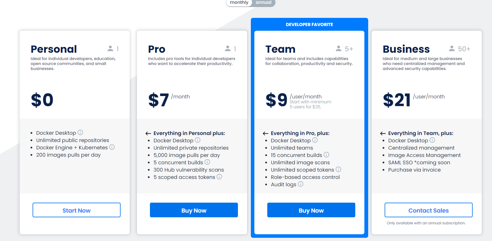 The screenshot of the pricing page is given below. As per this, it is free only for personal use and also the free version has a limitation on the number of image pulls per day.