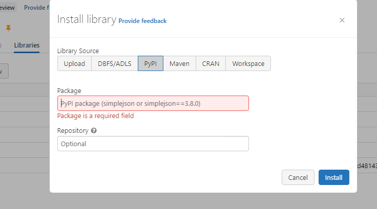 Admin or management privileges are required in this case. The package gets installed at the cluster level and the package will be available for all the other users using the same cluster. To perform this installation, select the cluster –> Click on the Libraries option –> click on install new. This option can be used to install Python packages, Java JAR files, R packages etc.